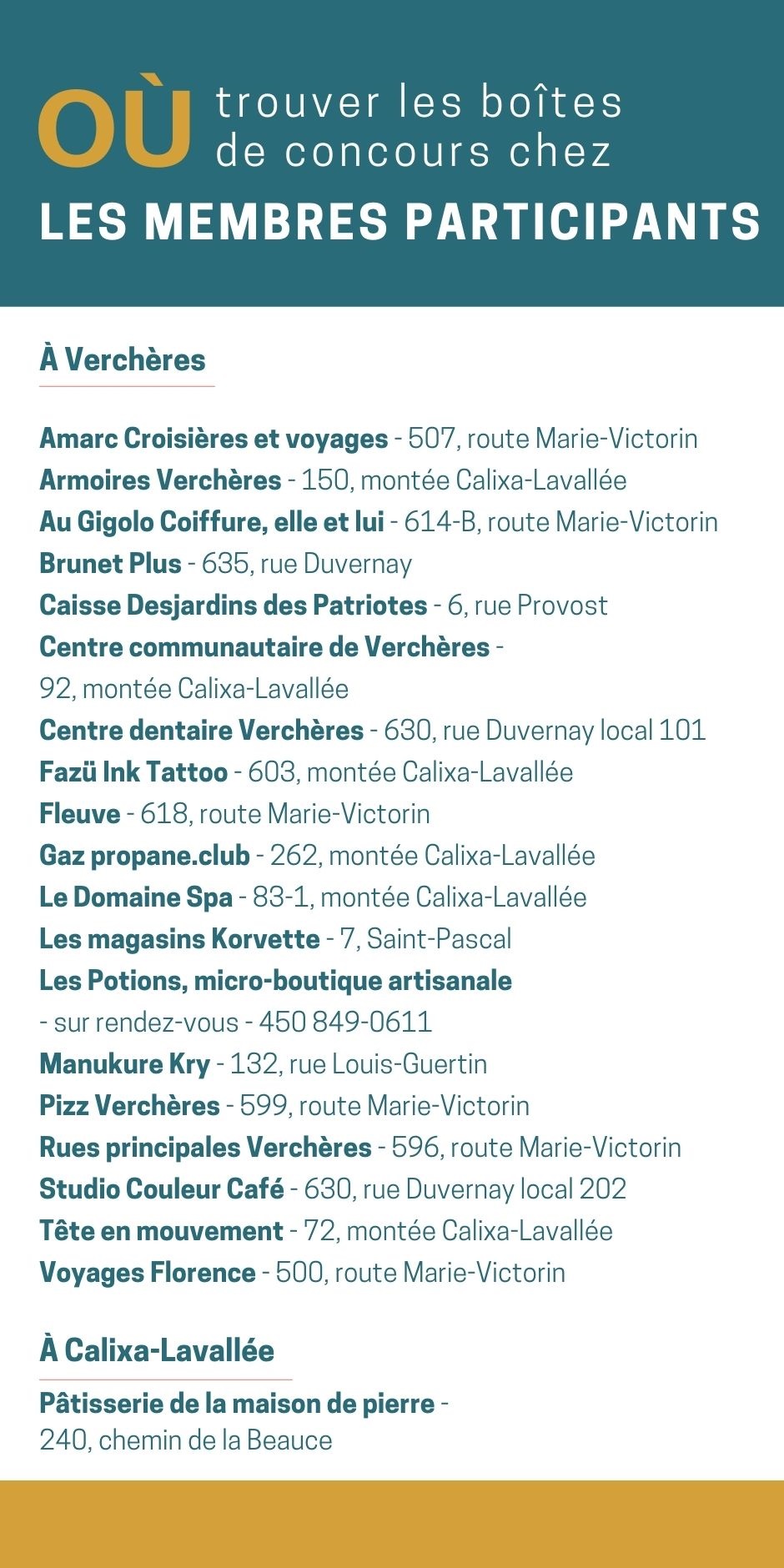 Les citoyens et citoyennes de Verchères et Calixa-Lavallée pourront déposer leur coupon de participation dûment rempli dans les boîtes de tirage disponibles à 19 endroits à Verchères et Calixa-Lavallée, coupon reçu sur le carton promotionnel de la campagne « Verchères, j’en suis fier! ».
