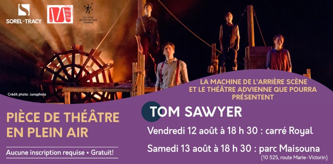 La Ville de Sorel-Tracy vous invite à assister gratuitement à deux représentations en plein air de la pièce de théâtre Tom Sawyer, le vendredi 12 août à 18 h 30 au carré Royal (centre-ville) ainsi que le samedi 13 août à 18 h 30 au parc Maisouna (10 525, route Marie-Victorin).