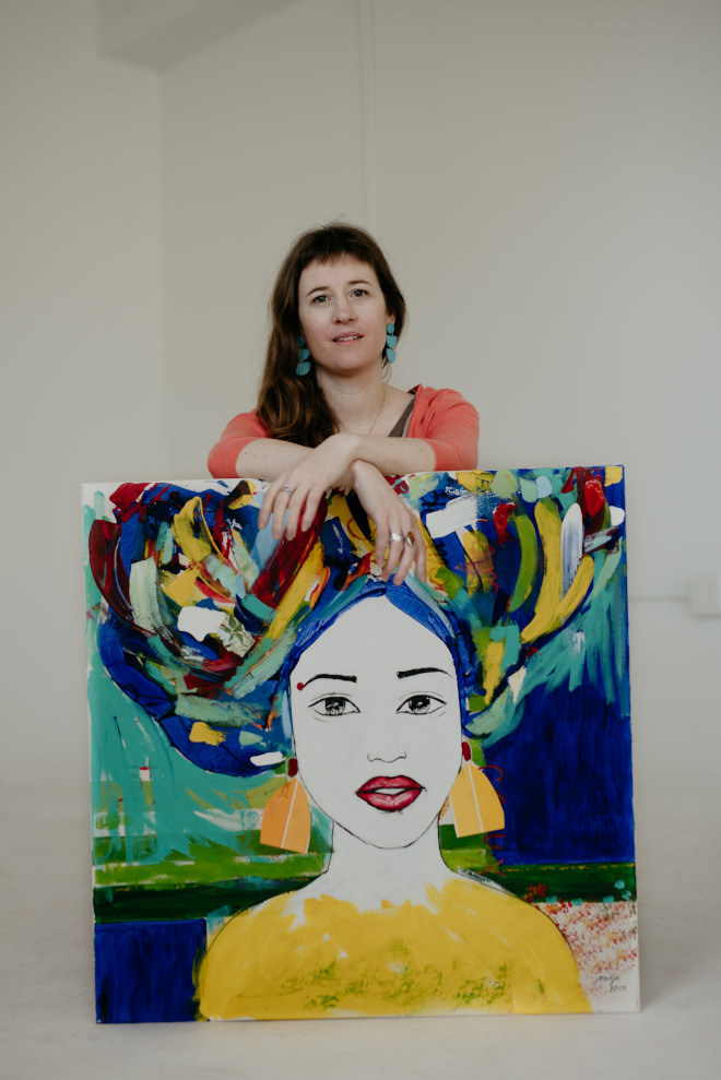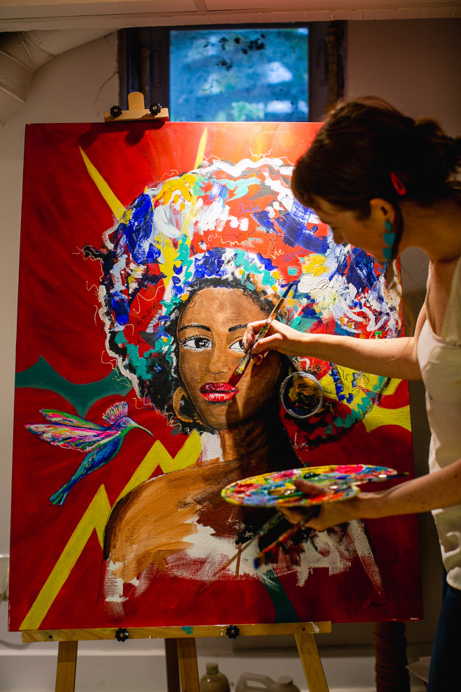 Tous les samedis et dimanches, de 10 h à 17 h, le public pourra découvrir les œuvres colorées et lumineuses qui font la belle part aux femmes issues des communautés culturelles. C’est que l’artiste, qui a habité 14 ans au Québec, a fait plusieurs voyages en Afrique et en Amérique latine ce qui l’inspire assurément dans ses créations. L’ensemble de ses peintures sur toile sont des toiles recyclées, déjà peintes, trouvées dans la rue ou chez les gens. Elle offre une seconde vie à ces objets voués à disparaître et laisse une trace de l’ancienne peinture visible en hommage à ce qui a été.
