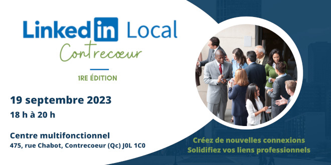 Le 19 septembre prochain, de 18h à 20h au Centre multifonctionnel de Contrecoeur, se tiendra la première édition de l’activité de réseautage basée sur le réseau social professionnel LinkedIn visant à rassembler les entrepreneurs, les gens d’affaires, les chercheurs d’emplois ainsi que les chercheurs de talent afin de créer et consolider les liens d’affaires.