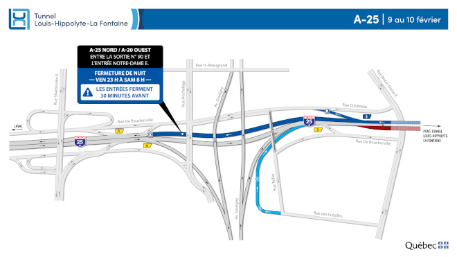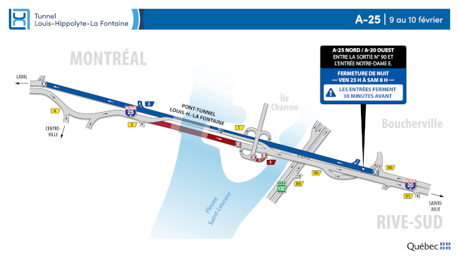• Fermeture complète de l’autoroute 25 en direction de Montréal (incluant le tunnel Louis-Hippolyte-La Fontaine) entre la sortie n° 90 – Aut. 20 ouest, route 132, La Prairie / USA, Varennes, aéroport P.‑E.‑Trudeau de l’autoroute 20 et l’entrée en provenance de la rue Notre-Dame Est.