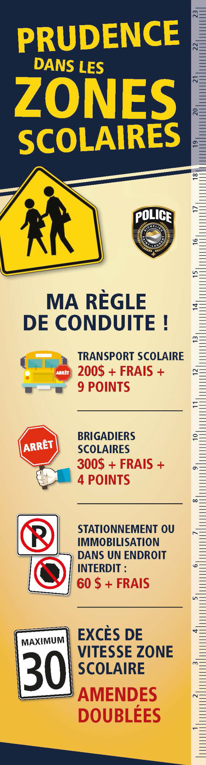 Les policiers profiteront de l’occasion pour sensibiliser les automobilistes à l’importance de respecter le Code de la sécurité routière dans les débarcadères et aux abords des écoles. Ils rappelleront l’importance de ralentir, de respecter les indications du brigadier scolaire, d’immobiliser leur véhicule lorsque les feux intermittents des autobus scolaires clignotent et de ne pas utiliser de cellulaire au volant. Les automobilistes pris en infraction pour excès de vitesse en zone scolaire recevront une amende doublée.