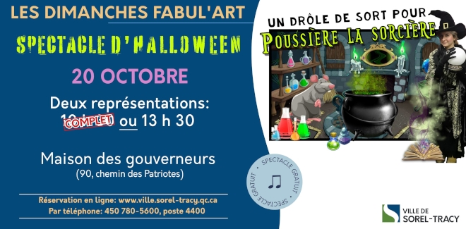 Dans le cadre des dimanches Fabul’Art, la Ville de Sorel-Tracy vous invite à assister gratuitement au spectacle familial Un drôle de sort pour Poussière la sorcière le dimanche 20 octobre à la Maison des gouverneurs (90, ch. des Patriotes). Des places sont toujours disponibles pour la représentation de 13 h 30.