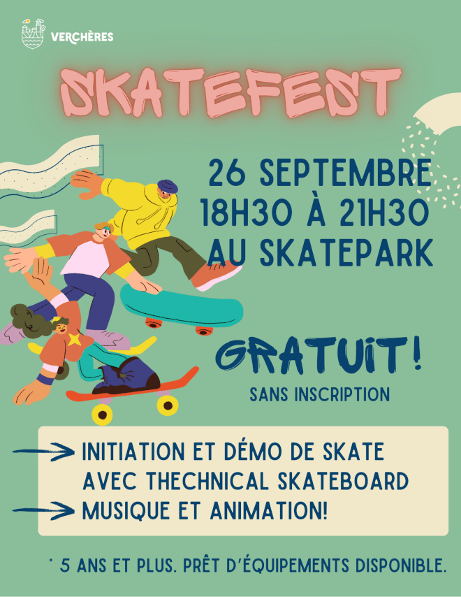 La Municipalité de Verchères est heureuse d’annoncer une nouvelle édition du Skatefest, qui aura lieu le vendredi 26 septembre 2025, de 18 h 30 à 21 h 30, au skatepark.