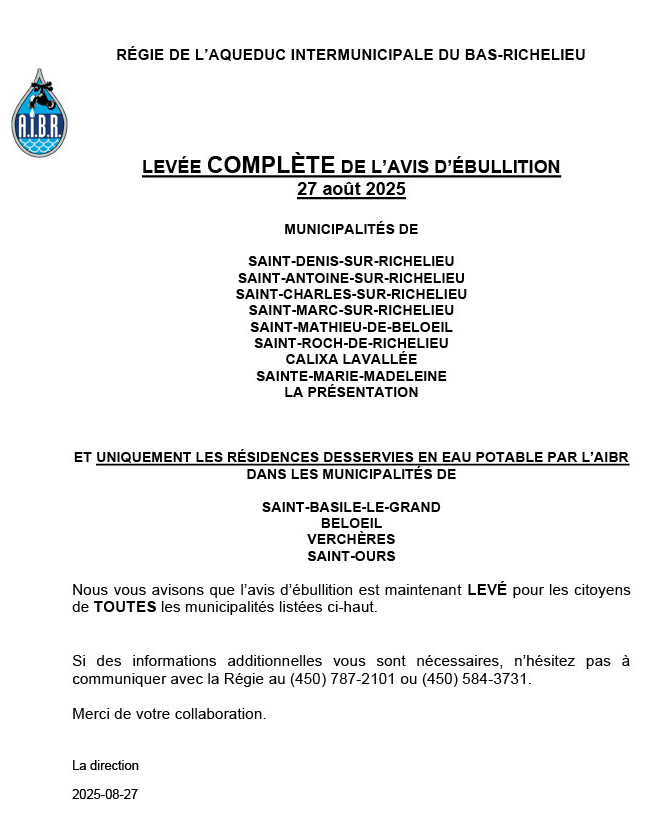 La Régie de l’aqueduc intermunicipale du Bas-Richelieu a levé l’avis d’ébullition en cours le 27 août 2025: