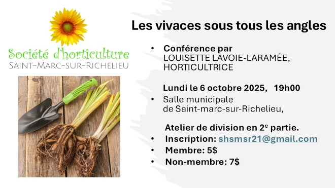 La Société d’horticulture de Saint-Marc-sur-Richelieu (SHSMSR) a le plaisir de vous inviter à une rencontre horticole dédiée aux plantes vivaces, ces alliées précieuses du jardin durable. Alors que l’automne s’installe, c’est le moment idéal pour découvrir comment diviser, cultiver et mettre en valeur vos vivaces préférées.