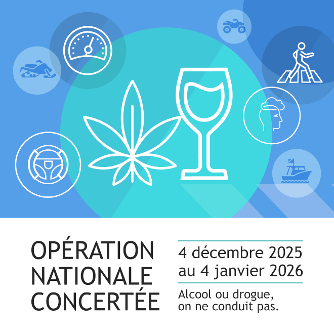 Les services de police du Québec, en collaboration avec les contrôleurs routiers de la Société de l’assurance automobile du Québec (SAAQ), intensifieront leurs interventions du 4 décembre 2025 au 4 janvier 2026, dans le cadre de l’opération nationale concertée (ONC) ciblant la capacité de conduire affaiblie par l’alcool ou la drogue. Ces interventions se traduiront entre autres par des dépistages qui pourraient être réalisés lors de contrôles routiers. Nous tiendrons également une journée nationale d’opérations de sécurité routière afin de contrer la capacité de conduire affaiblie et, par le fait même, procéder à la vérification des pneus d’hiver, le 5 décembre, partout au Québec.