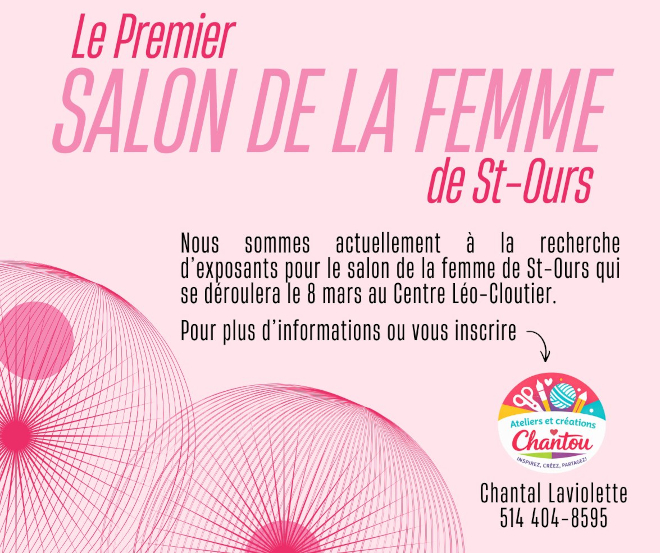 La Ville de Saint-Ours a utilisé les réseaux sociaux pour faire savoir qu’il reste encore quelques places pour ceux et celles qui voudraient participer au premier Salon de la femme de St-Ours organisé par Ateliers et Créations Chantou.