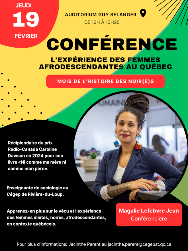 Dans le cadre du mois de l’histoire des Noir(e)s, le Cégep de Sorel-Tracy accueillera Magalie Lefebvre Jean qui a reçu le prix Radio-Canada Caroline Dawson dont l’objectif est de récompenser l’ouvrage d’une personne écrivaine francophone issue de la diversité. L’événement gratuit et ouvert à tous aura lieu le jeudi 19 février de 12 h à 13 h 20 à l’auditorium Guy-Bélanger du Cégep.