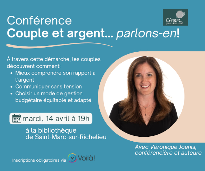 La bibliothèque de Saint-Marc-sur-Richelieu est fière d’annoncer une conférence enrichissante intitulée « Couple et argent… parlons-en! », animée par Véronique Joanis, conférencière et auteure reconnue.