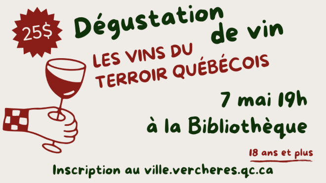 Dans cette optique, la bibliothèque accueillera un atelier de dégustation de vins du terroir québécois le 7 mai, de 19h. Cette activité s’adresse aux adultes de 18 ans et plus souhaitant approfondir leurs connaissances tout en vivant une expérience conviviale et gourmande.
