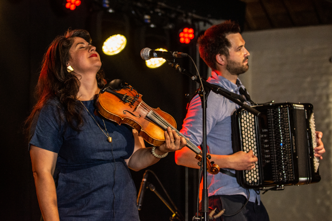 Le duo Nadine et Sammy, qui amorcera la deuxième soirée des Grands concerts, est un autre exemple qui prouve que la musique trad ne connaît pas de frontières. Élevée au sein d’une famille de musiciens en Gaspésie, Nadine Landry a consacré plus de 20 ans à la musique traditionnelle en interprétant des airs Old-time et cajuns. Aussi à l’aise à la guitare qu’à la contrebasse, son jeu énergique, sa voix puissante et sa bonne humeur contagieuse contribuent au succès du duo. Originaire du Minnesota, Sammy Lind est quant à lui reconnu comme l’un des violoneux Old-time les plus acclamés de sa génération. Cofondateur du Foghorn Stringband (dont Nadine est aussi membre), il a parcouru le monde, partageant son amour pour les airs traditionnels des Appalaches et du Midwest. Son jeu est le reflet d’une passion et d’un respect profond pour les violoneux Old-time légendaires.