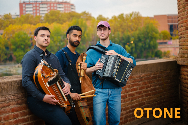 Entre Gascogne et Centre-France, Otone trace un chemin singulier au cœur des musiques traditionnelles. Porté par Thomas Fradin, Naël Tripoli et Charles Pouységur, le trio tisse un dialogue vibrant entre vielle à roue, boha (cornemuse gasconne), tambourin à cordes et accordéon diatonique. Ancrés dans la danse, ces trois musiciens puisent dans les répertoires populaires du Sud-Ouest et du Centre-France une musique portée par une énergie contemporaine et une sensibilité collective. Leur son, à la fois puissant et raffiné, est une musique de partage et de transe. Le trio invite à un véritable voyage à travers les terroirs et les timbres.