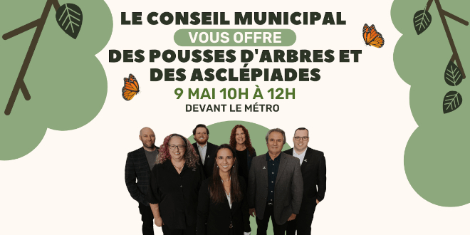 Le Conseil municipal de Verchères offrira des pousses d’arbres et d’asclépiades, une plante primordiale pour la survie du papillon monarque, le samedi 9 mai prochain de 10h à midi au Métro Verchères.